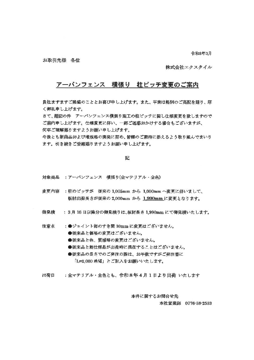 【エクスタイル】アーバンフェンス横張り柱ピッチ変更のご案内