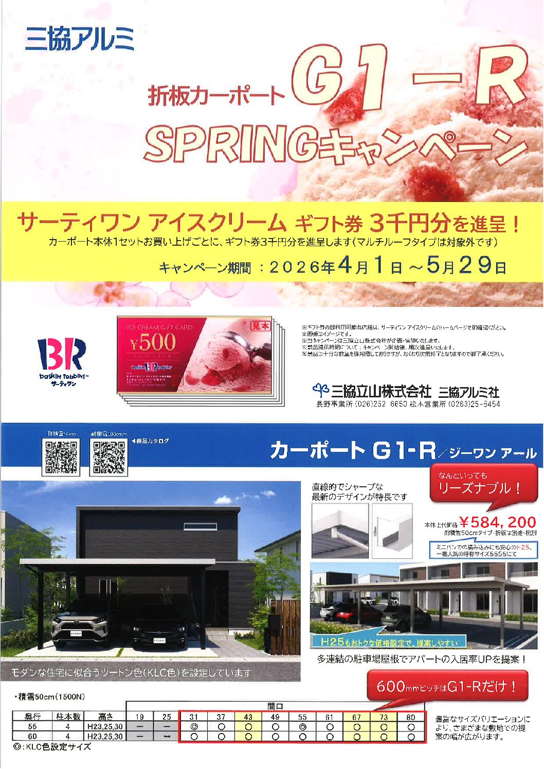 【三協アルミ】カーポート「G1-R」SPRINGキャンペーンのお知らせ