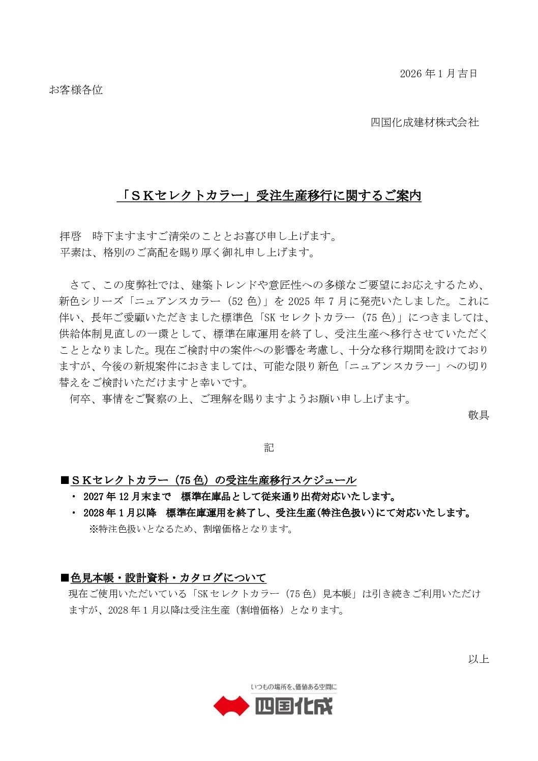 【四国化成建材】「SKセレクトカラー」受注生産移行に関するご案内