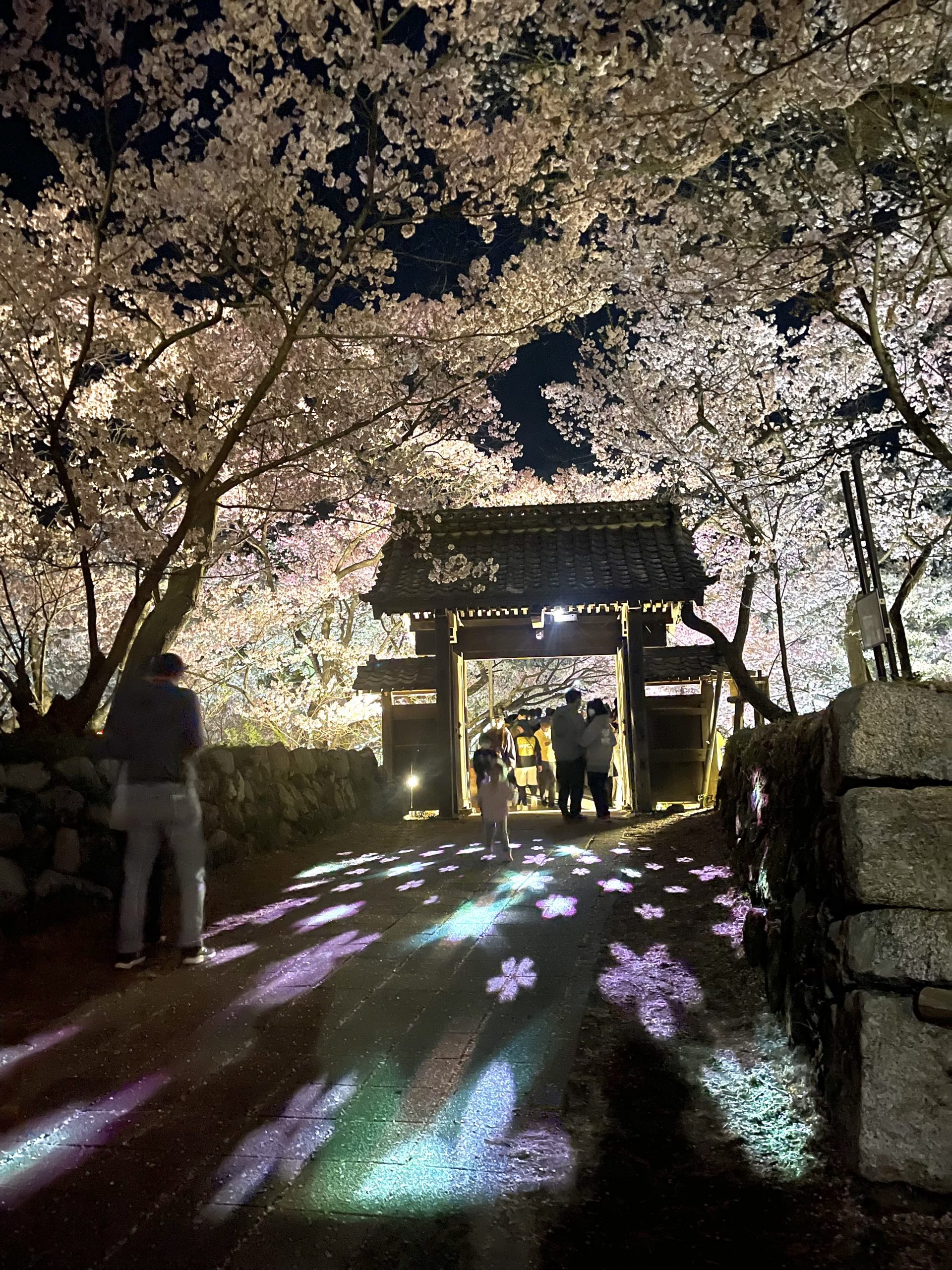 屋台なども出でいて賑わっていました。今回夜桜を見に行きプロジェクションマッピングと桜の良い感じの写真が取れたので見てみてください📷