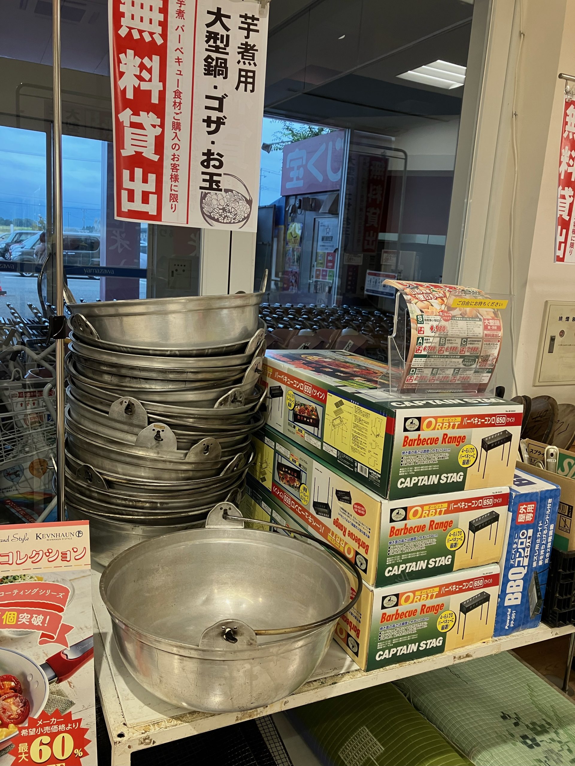 帰りに寄ったご当地スーパーで芋煮用の鍋やゴザなどを無料貸し出ししていました。