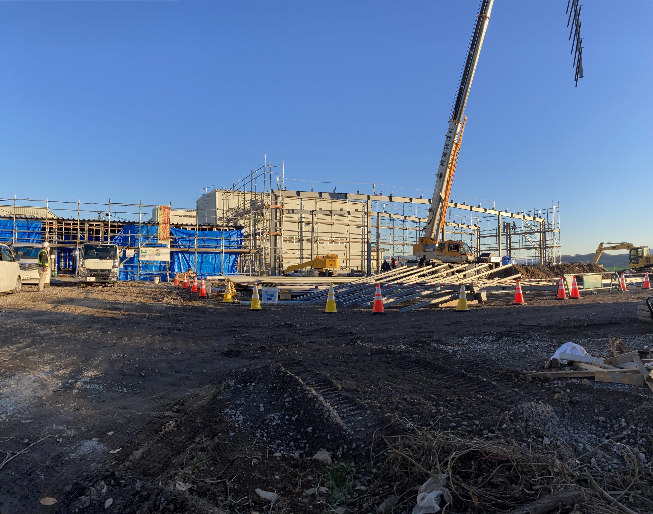 大きなクレーンが入り、倉庫の骨組みを組んでいました。