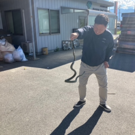 朝、材料積み込みしようと会社の倉庫を開けると目の前にヘビが… こちらに気が付いて倉庫の奥に逃げてしまいそうだったので 引っ張り出して草むらへ移動させました。 意外とおとなしく、つぶらな瞳でかわ